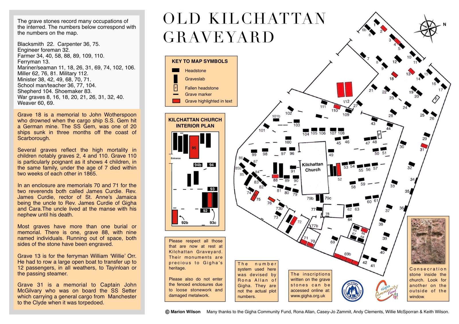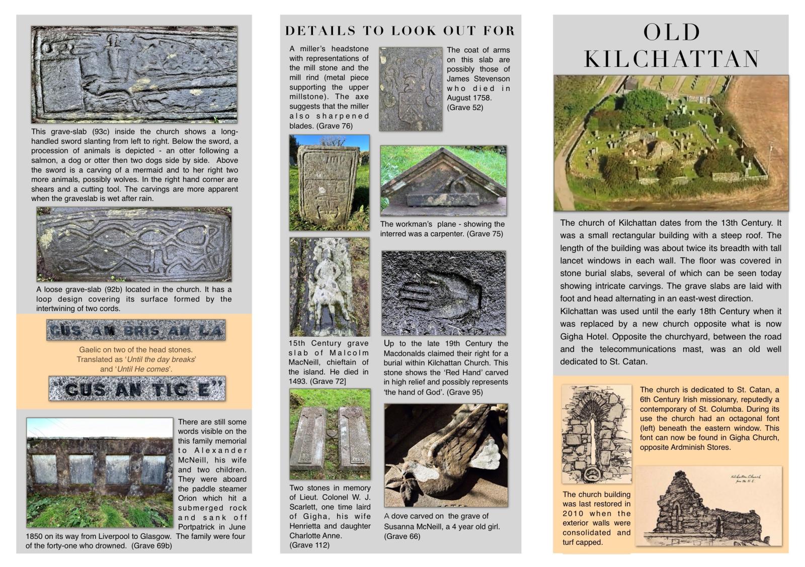 Produced by Marion Wilson in 2024, leaflets with informtion on Old Kilchattan are available on the island. Images of the leaflet are available below.